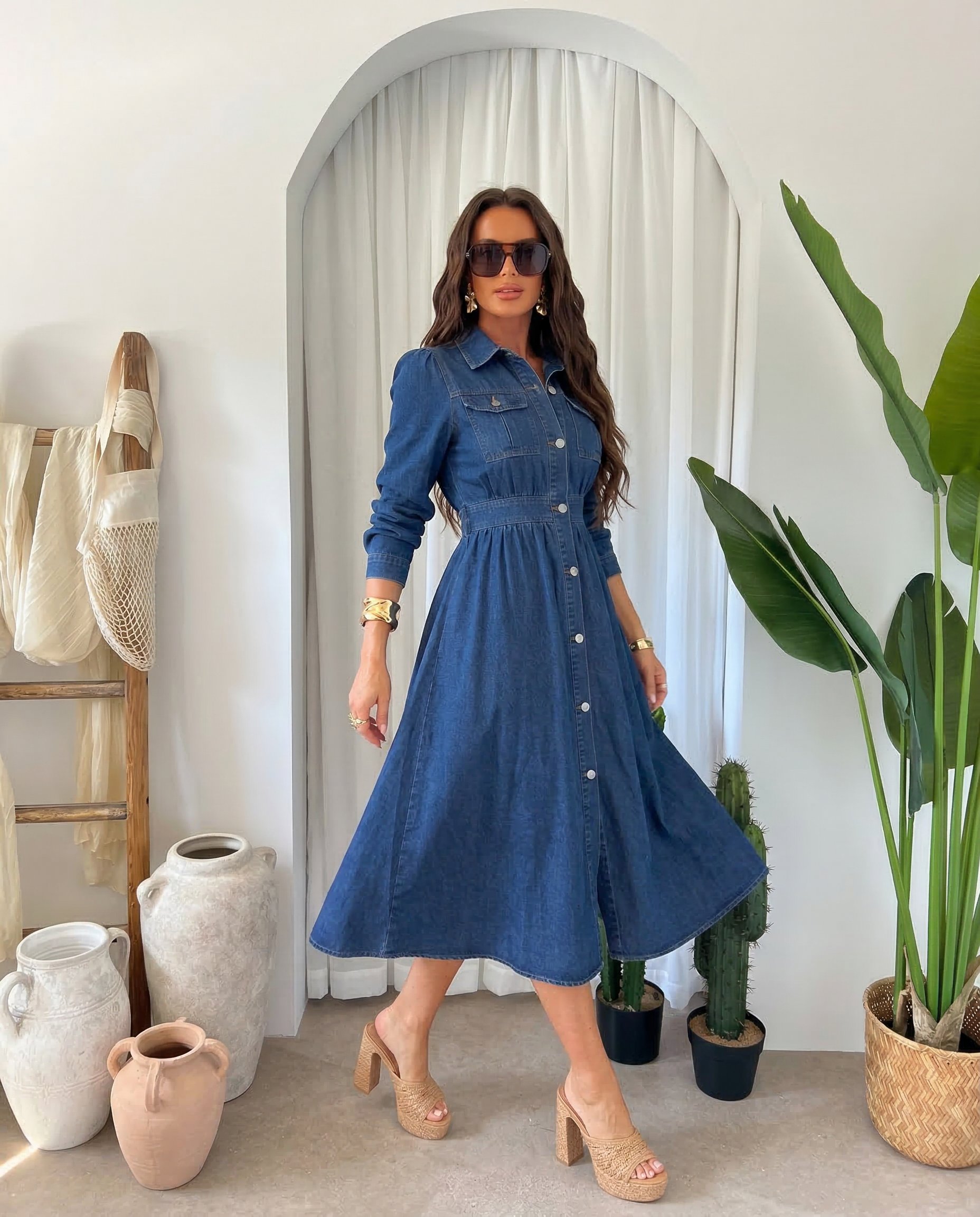 Denimowa sukienka midi z długim rękawem, zapinana na guziki, podkreśla talię, gwarantuje wygodę i modny styl każdego dnia.