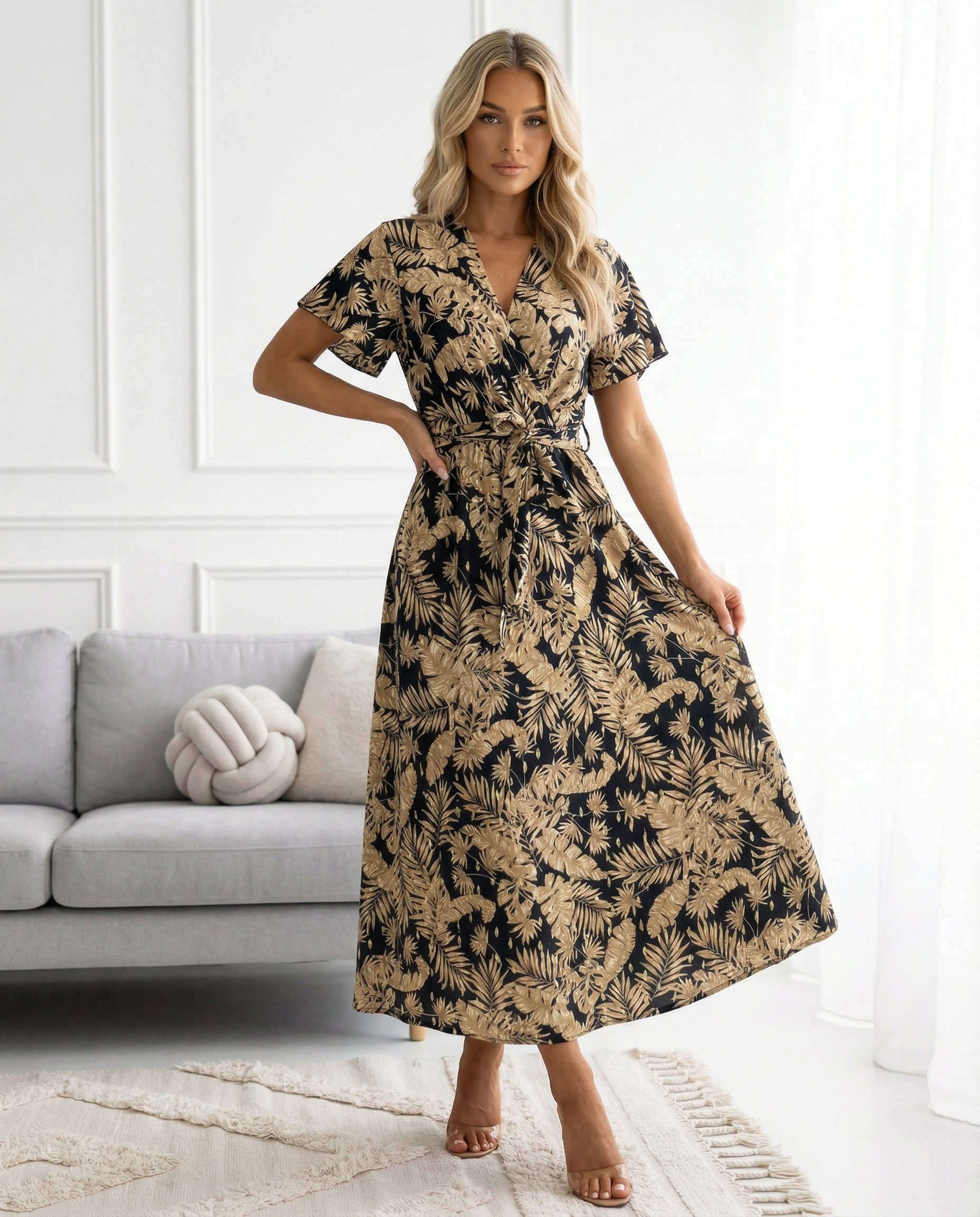 Sukienka z przekładanym dekoltem oraz krótkim rękawkiem. Wykonana jest z delikatnego, zwiewnego naturalnego materiału.