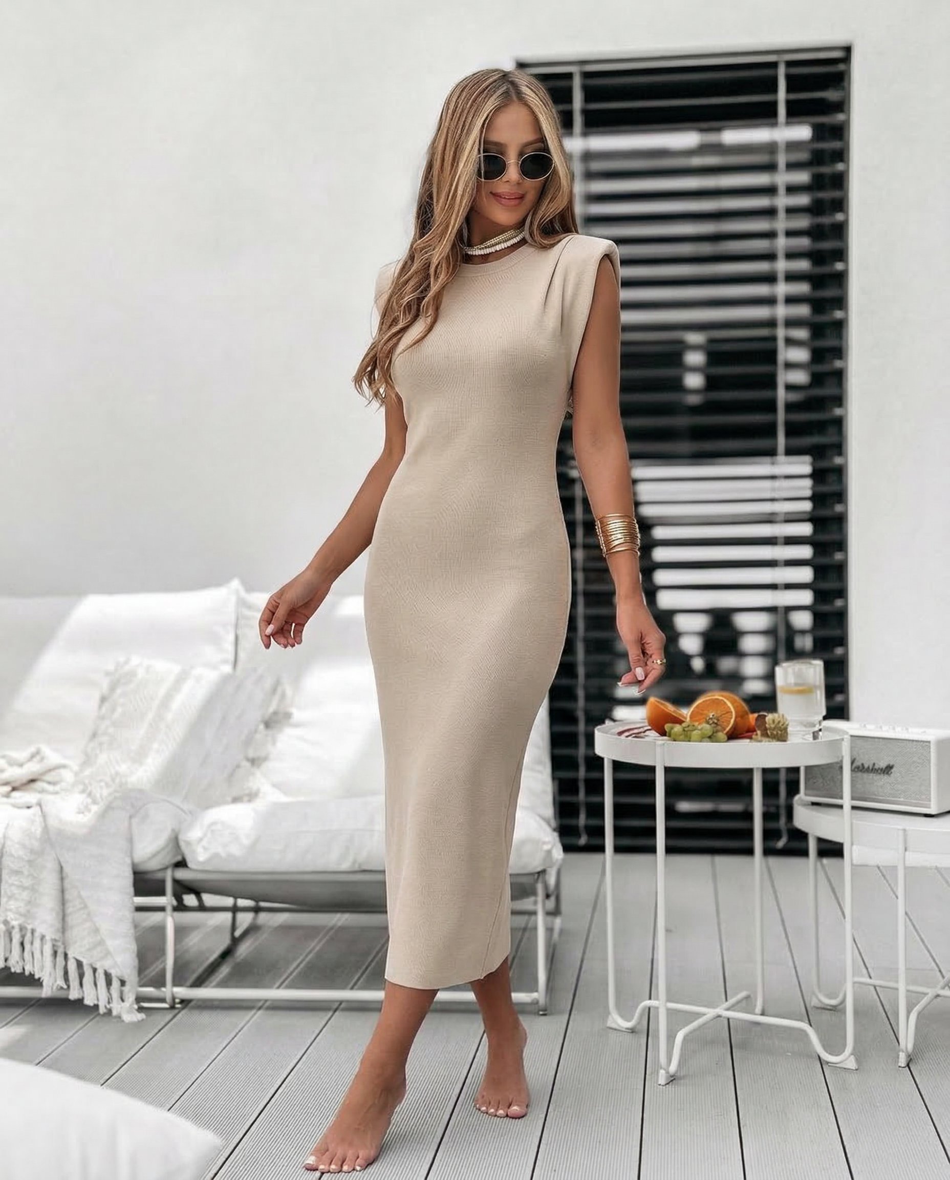 Dopasowana midi, podkreślająca sylwetkę, z modnymi poduszkami na ramionach; wygodny, elastyczny materiał i uniwersalny styl.