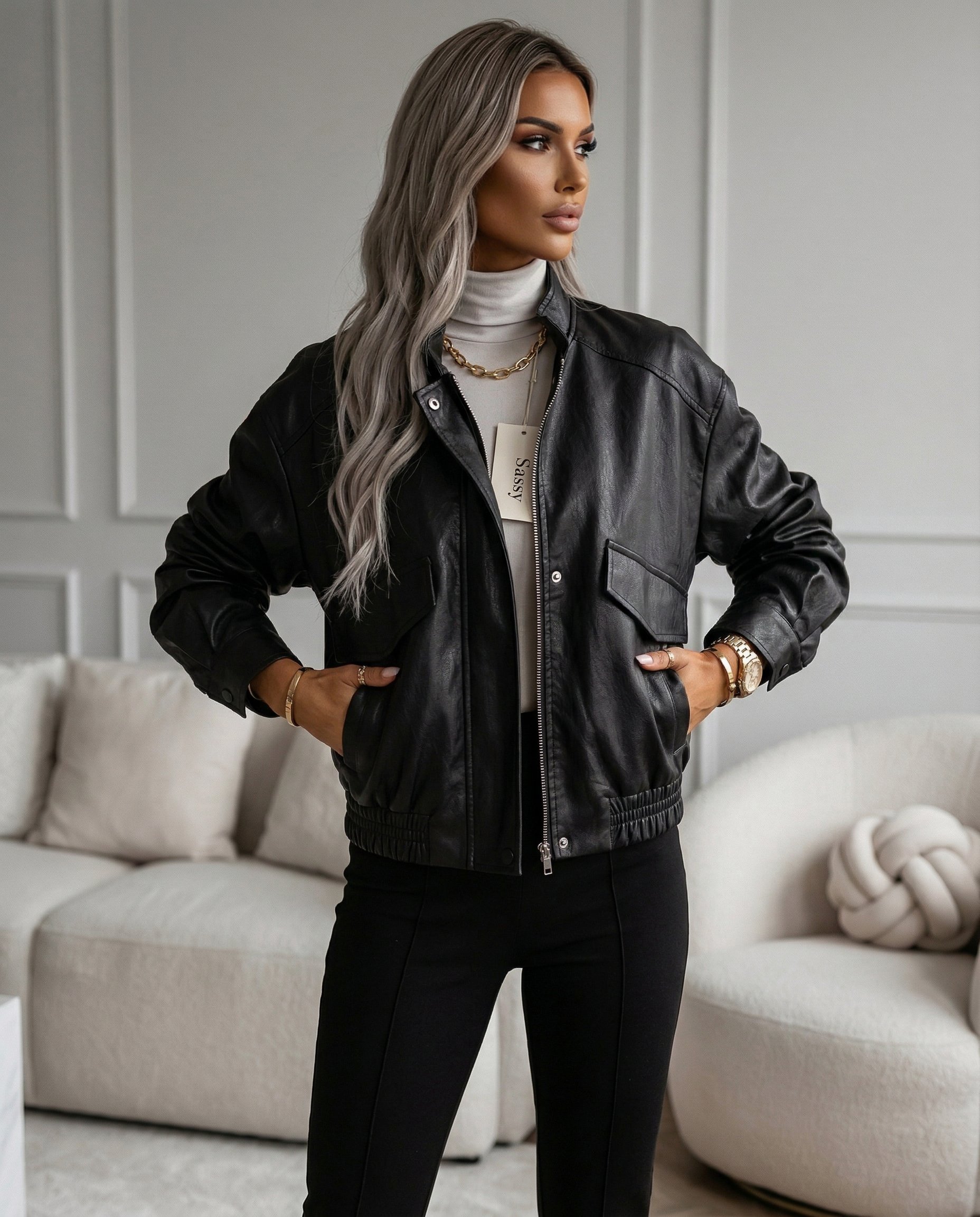 Modna, krótka kurtka o lekko oversize’owym kroju z elastycznym dołem, dwoma dużymi kieszeniami i stójką – idealna na wiosnę i lato.